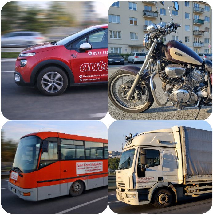 Skupiny A,B,C,E,D,T – osobné autá, motorky, nákladiaky, autobusy aj traktor